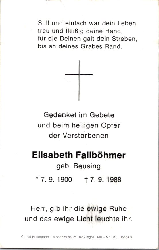Fallböhmer, Elisabeth, geb. Beusing, 1900-1988 NEU