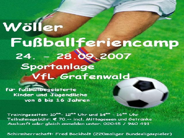 In den Herbstferien findet vom 24.09. bis zum 28.09.2007 zum ersten Mal unser Wöller - Fußballferiencamp auf dem Sportplatz am Sensenfeld statt. Die Schirmherrschaft übernimmt der 220-malige Bundesligatorhüter Fred Bockholt. Der bekannte Bottroper Fußballer spielte u.a. bei Bayer Leverkusen, Rot Weiß Essen und Kickers Offenbach.