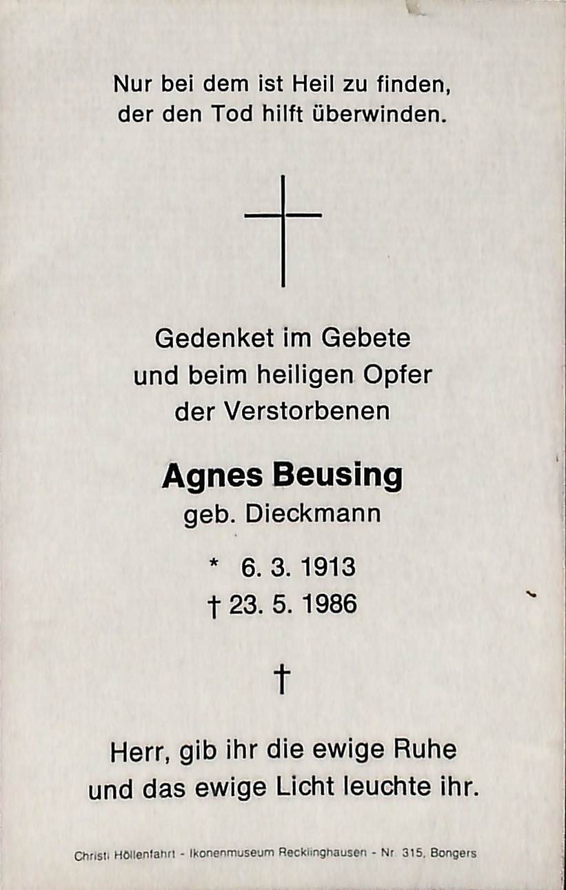 Beusing, Agnes, geb. Dieckmann, 1913-1986 NEU