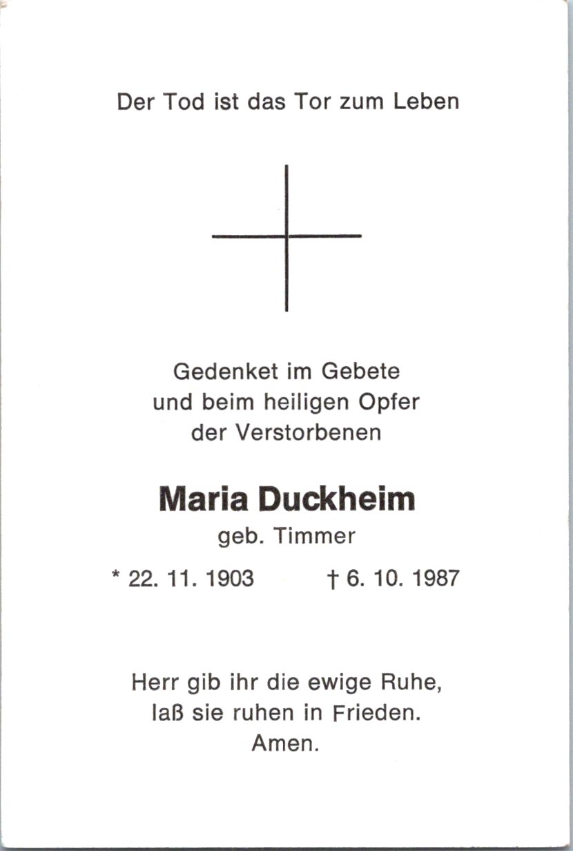 Duckheim, Maria, geb. Timmer, 1903-1987 NEU